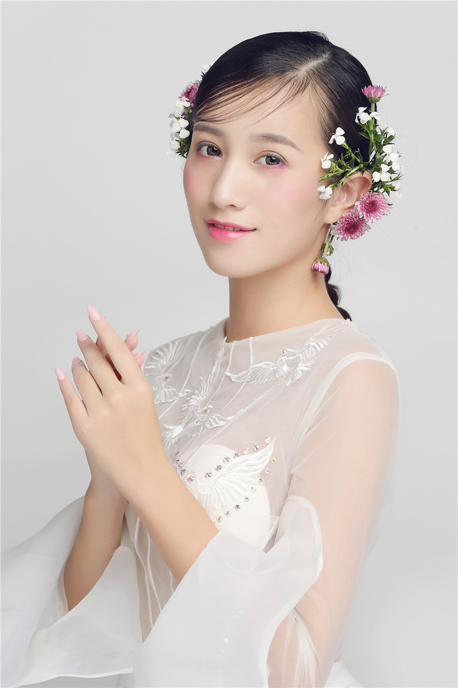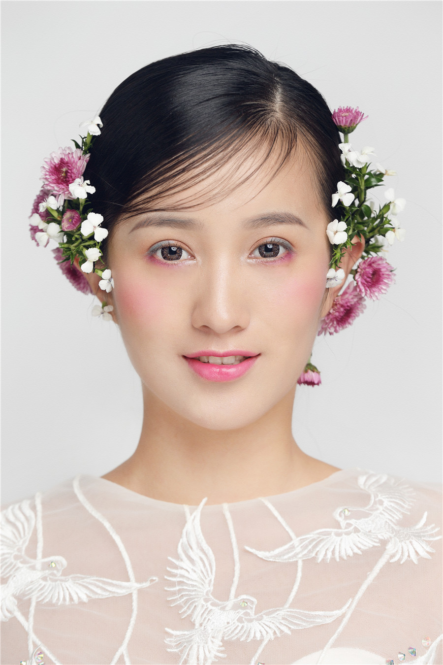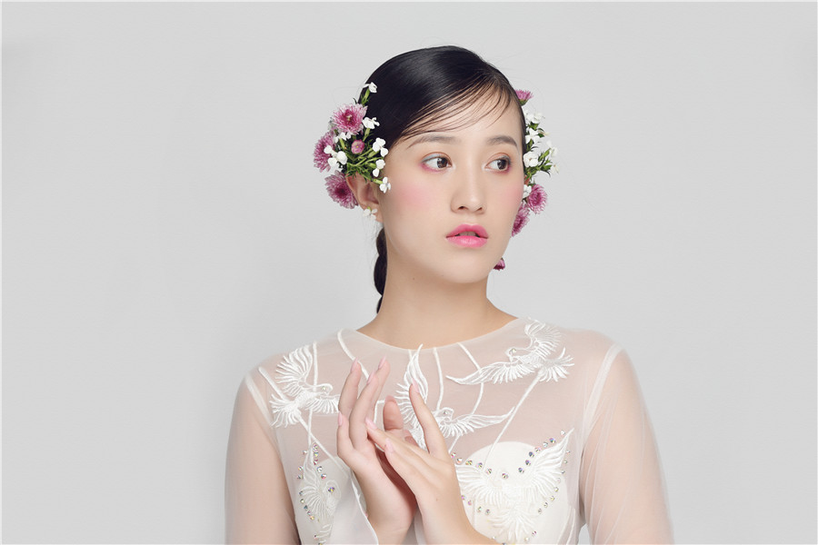 麗竹學(xué)校彩妝作品---花樣鮮花新娘:鮮花打造的新娘頭飾,展現(xiàn)美顏動人的一面。嬌艷的鮮花點(diǎn)綴于發(fā)絲之上,襯托新娘更加美麗嬌嫩。