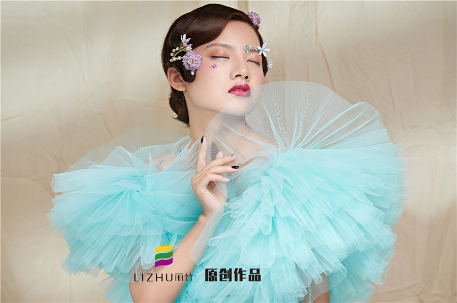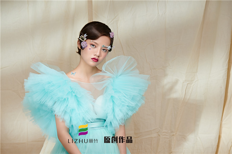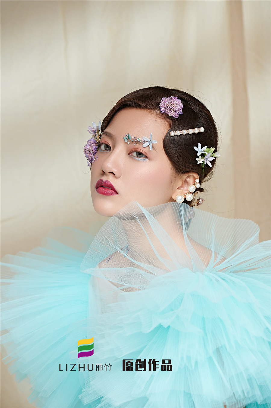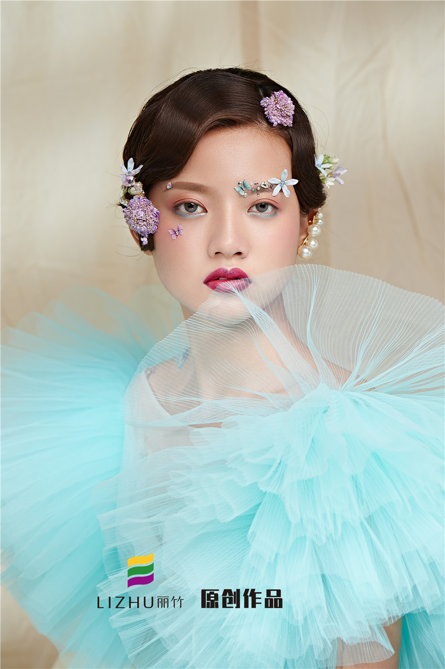 麗竹學(xué)校彩妝作品---氣質(zhì)名媛造型:藍(lán)色輕紗加上妝容花朵點綴,頭飾與發(fā)型的完美搭配,流淌出輕柔舒緩之美,簡約自然的情緒態(tài)度。