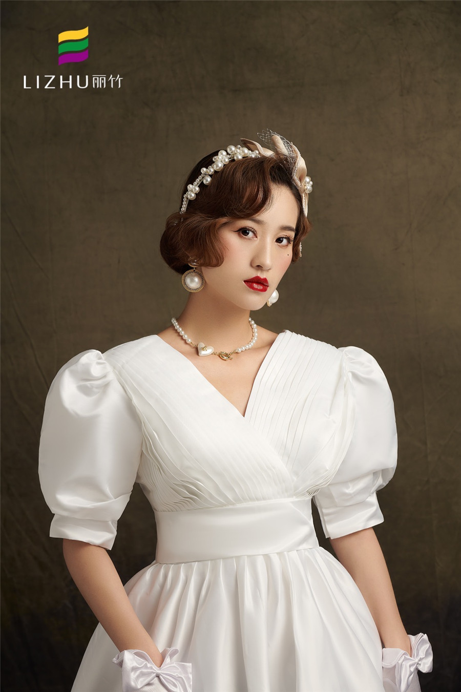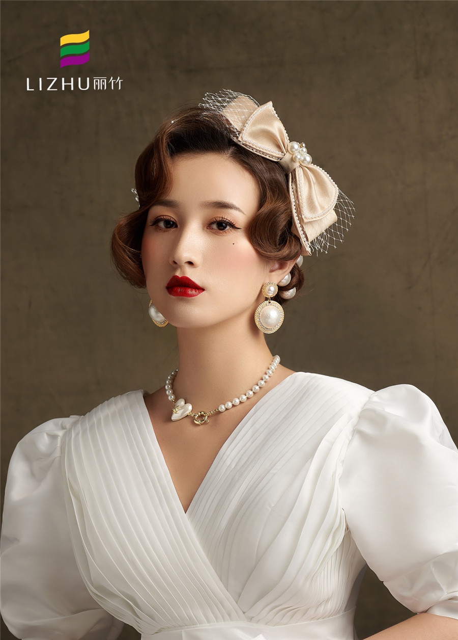 廣西化妝培訓學校(麗竹化妝培訓學校)作品---輕復古系列妝容造型:時尚優(yōu)雅的復古盤發(fā),佩戴香檳蝴蝶結頭飾點綴,畫上大氣動人麗人妝,穿上簡潔緞面氣質婚紗,展現(xiàn)出既純潔又優(yōu)雅的獨有氣質。