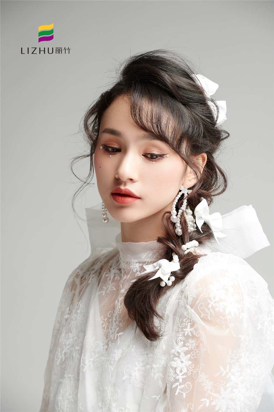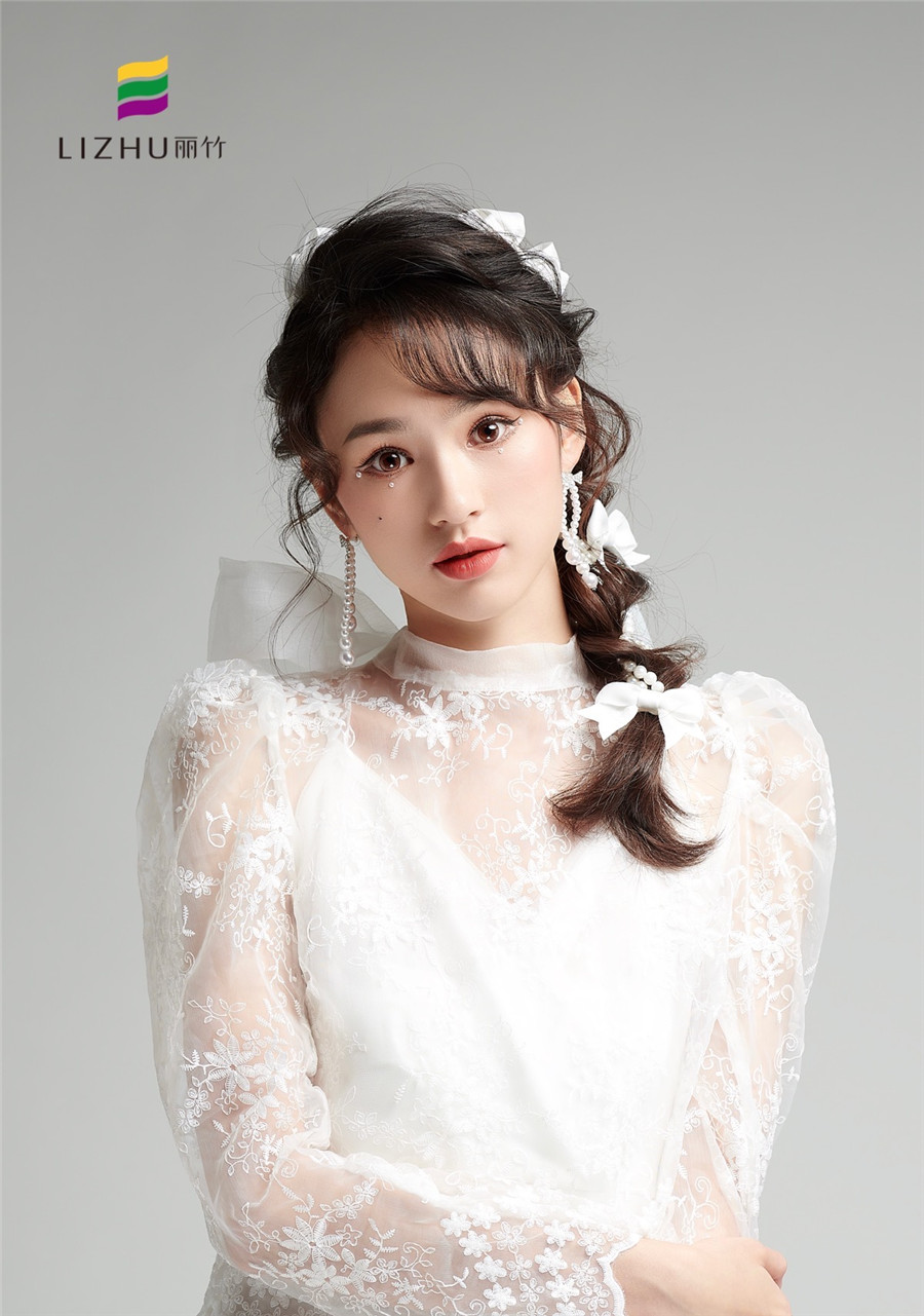廣西化妝培訓學校(麗竹化妝學校)---甜美時尚新娘造型:簡約的便面編發(fā),搭配優(yōu)雅的白色蝴蝶結點綴。素雅動人,甜美優(yōu)雅,無須濃墨重彩,即可打造氣質恬靜新娘。