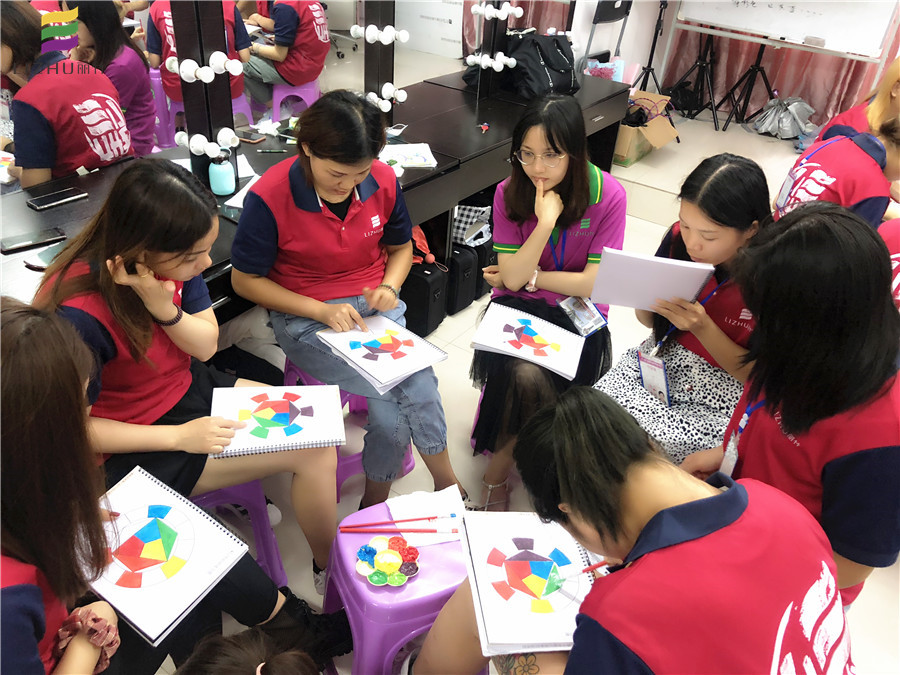 如果你認(rèn)為這只是簡(jiǎn)單在相應(yīng)的空格里上色,那就錯(cuò)了。學(xué)過(guò)彩妝,美甲,美發(fā)的人都知道,色彩分有冷色系和暖色系,在學(xué)習(xí)色彩搭配的時(shí)候,學(xué)員必須要對(duì)這兩類色調(diào)的顏色分清,同時(shí)還要有能進(jìn)行冷暖色調(diào)進(jìn)行調(diào)配的能力。而同學(xué)們正在做的就是這個(gè)練習(xí)。