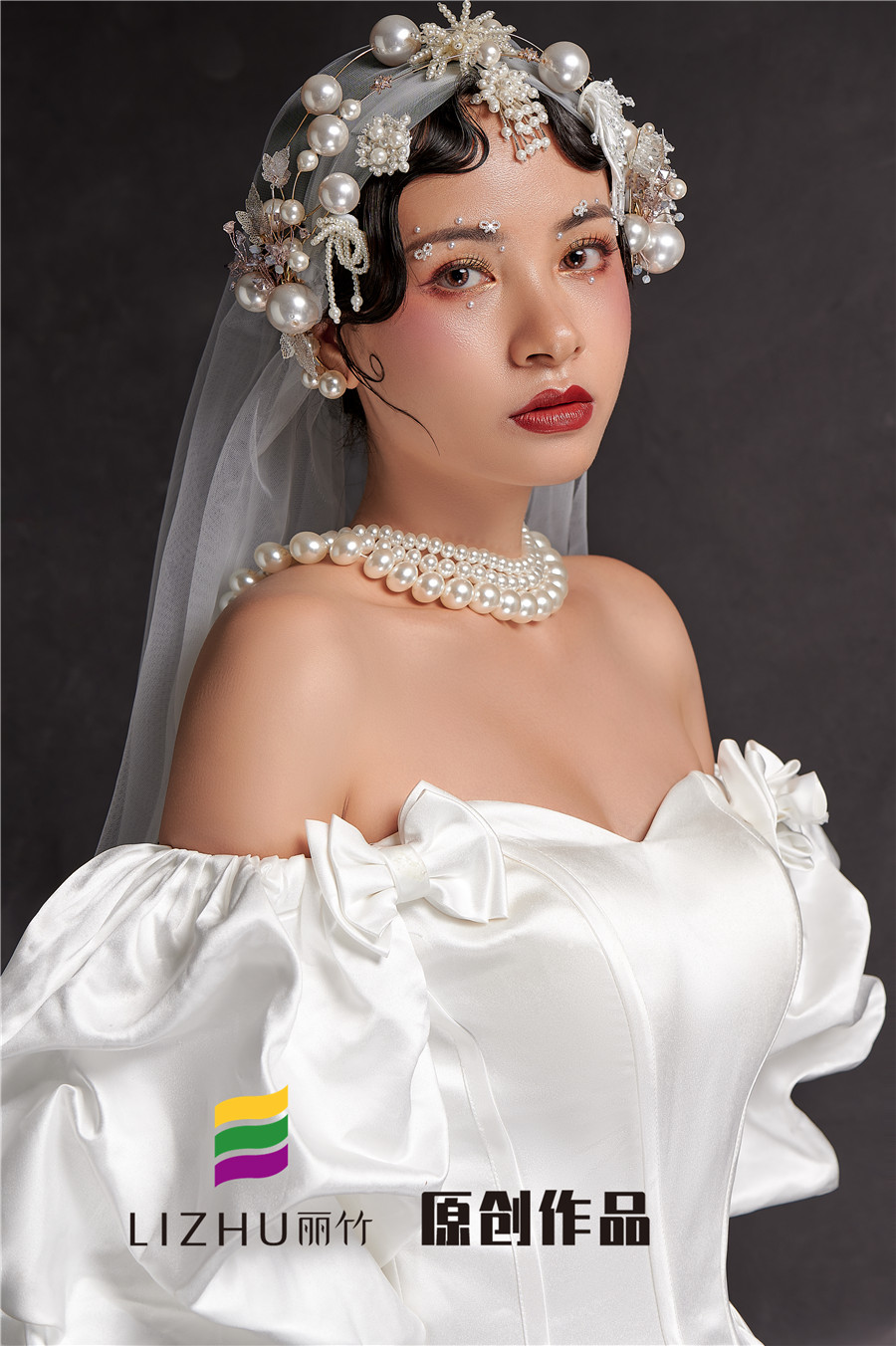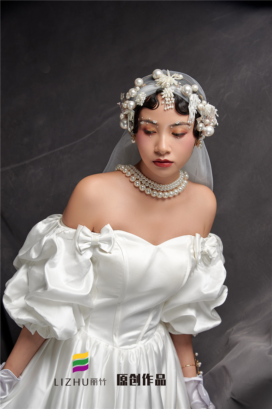 廣西排名前十彩妝學(xué)校分享:麗竹學(xué)校彩妝作品---輕奢復(fù)古造型:潔白充滿設(shè)計感的禮服,珍珠點綴,星光點點的,是夢幻與現(xiàn)實的交替。