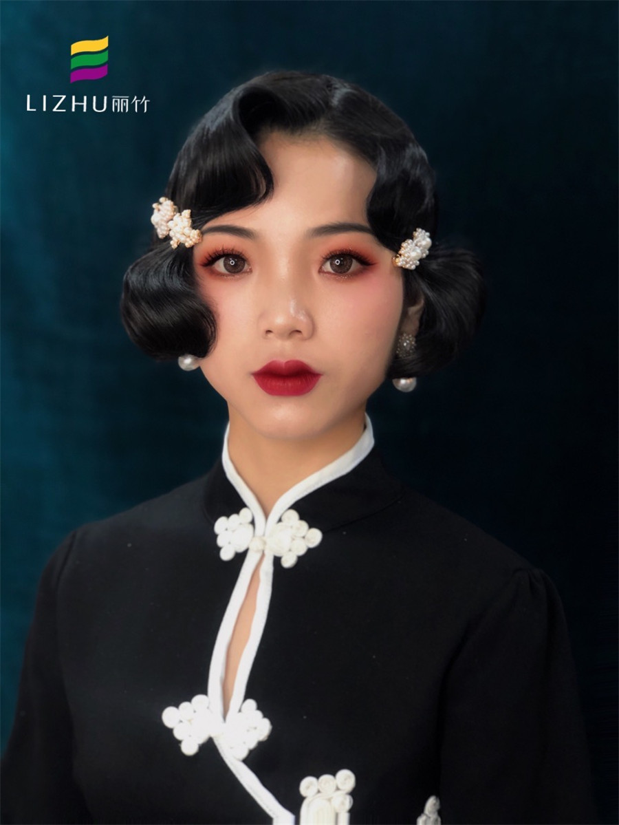 廣西彩妝造型培訓(xùn)學(xué)校作品---旗袍妝容造型:流暢圓潤的復(fù)古手推波發(fā)型,涂抹婀娜多姿的烈焰紅唇,身穿黑色改良國風(fēng)旗袍,還原老上海復(fù)古風(fēng)情,優(yōu)雅復(fù)古韻味十足。