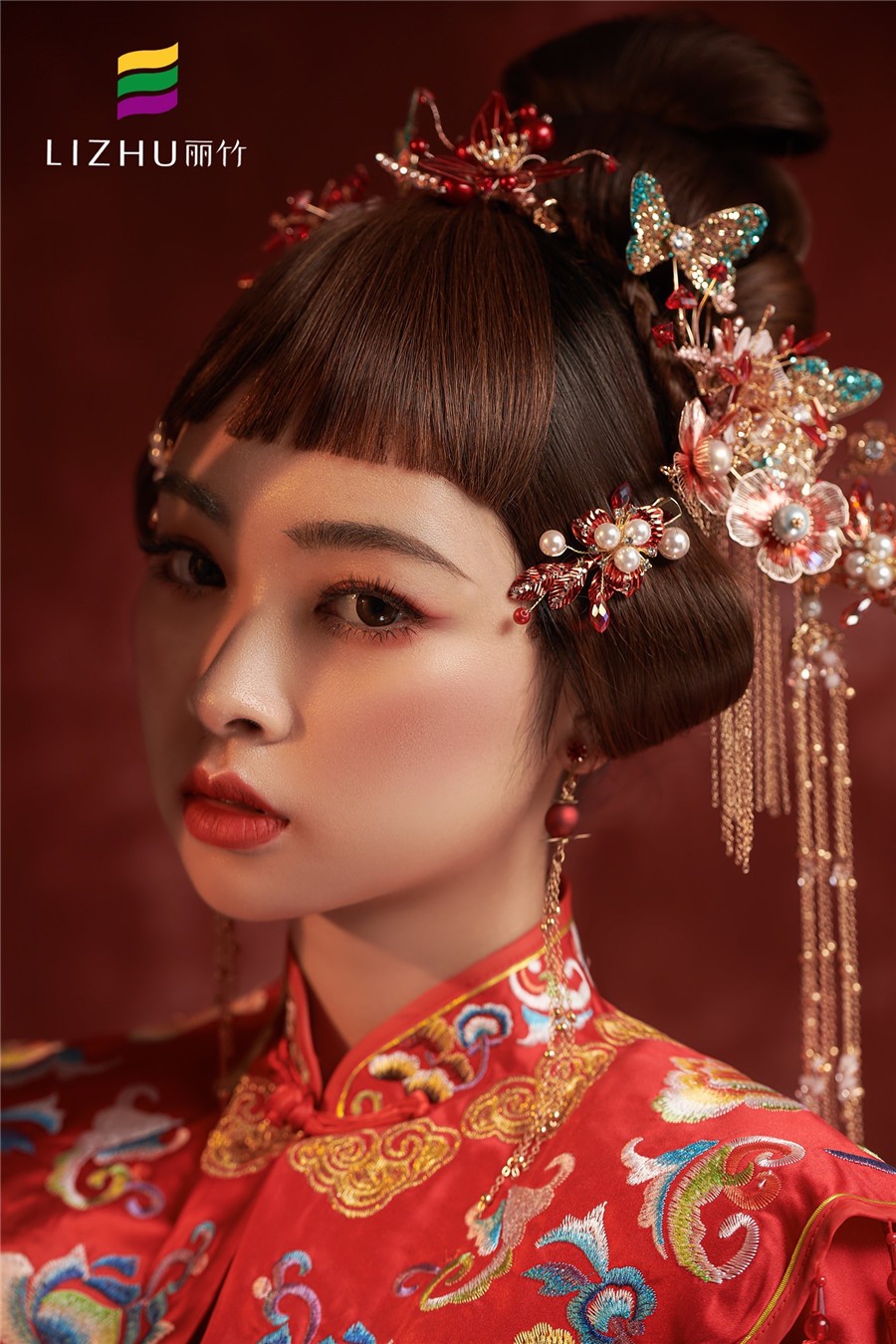 麗竹學(xué)校彩妝作品---中式秀禾新娘造型:蝶舞蹁躚,吉祥如意。極具東方魅力的色彩,妝造出獨(dú)特的國(guó)風(fēng)。一襲中國(guó)紅,端莊典雅,是千年沉淀下來(lái)的古韻悠長(zhǎng)。