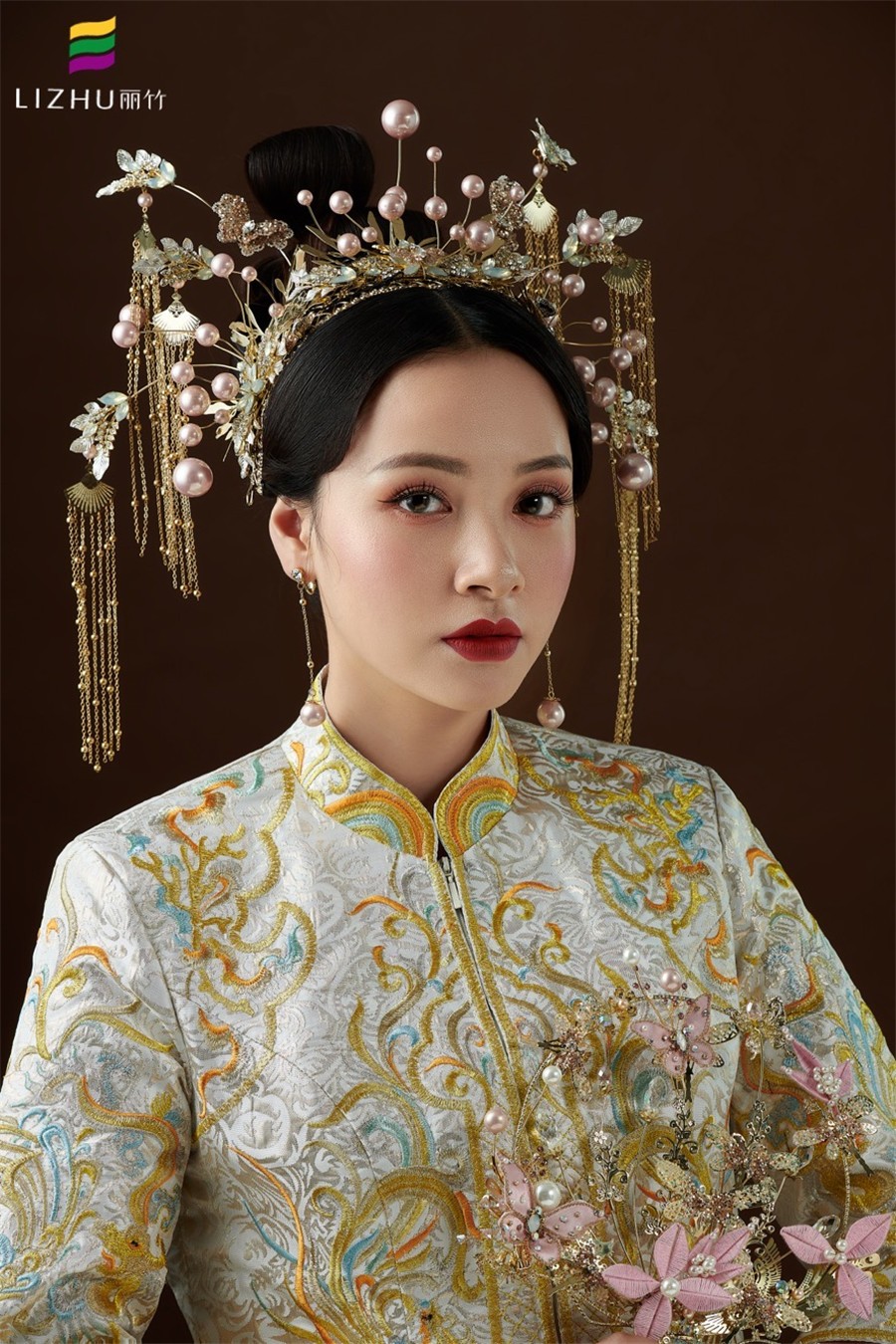 麗竹學(xué)校作品:中式秀禾新娘妝容造型:初見是始料未及的心動(dòng),沁人心扉的一抹金色,雍容華貴直擊眼球,恬雅流蘇微晃動(dòng)人,頗有小家碧玉的感覺。