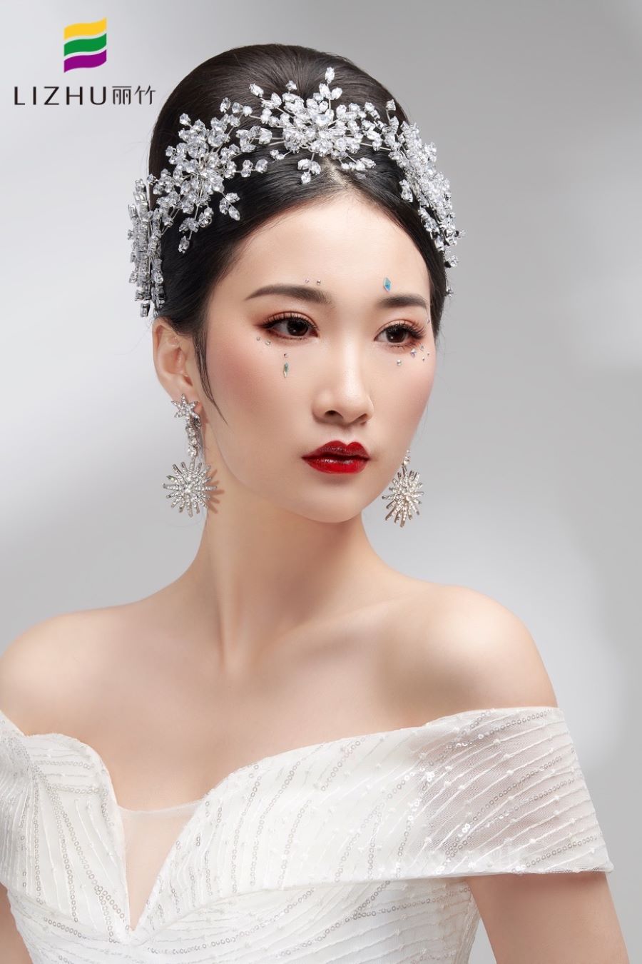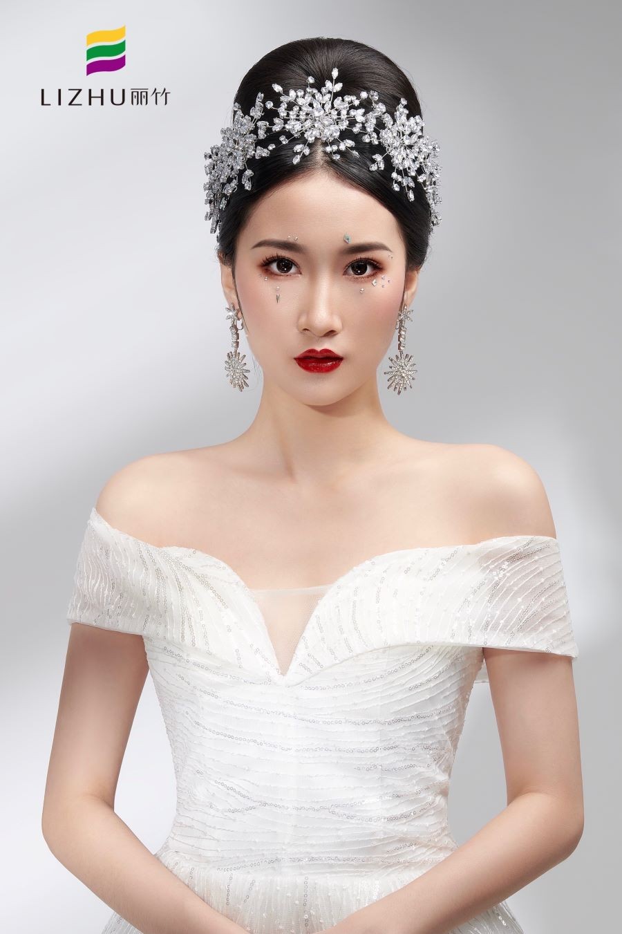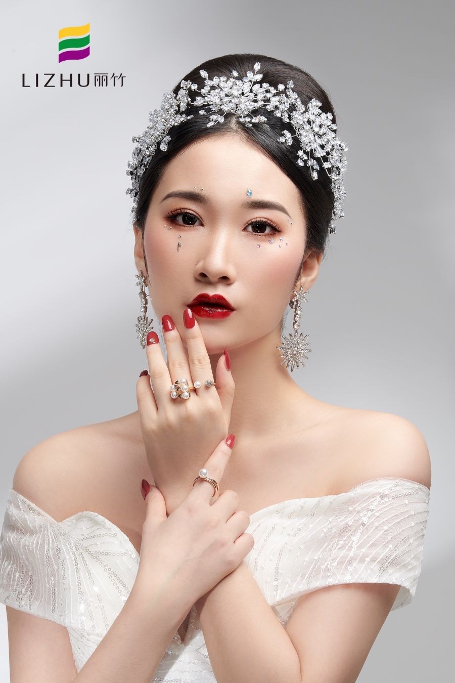 南寧技術好的彩妝培訓(麗竹彩妝學校)作品:鉆石新娘造型:輕薄不厚重的底妝做基礎,描繪淡雅而精致的妝容,打造Blingbling的眼妝。搭配碎鉆貼面營造靈動感,頭飾與眼部鉆石磚石相互呼應。
