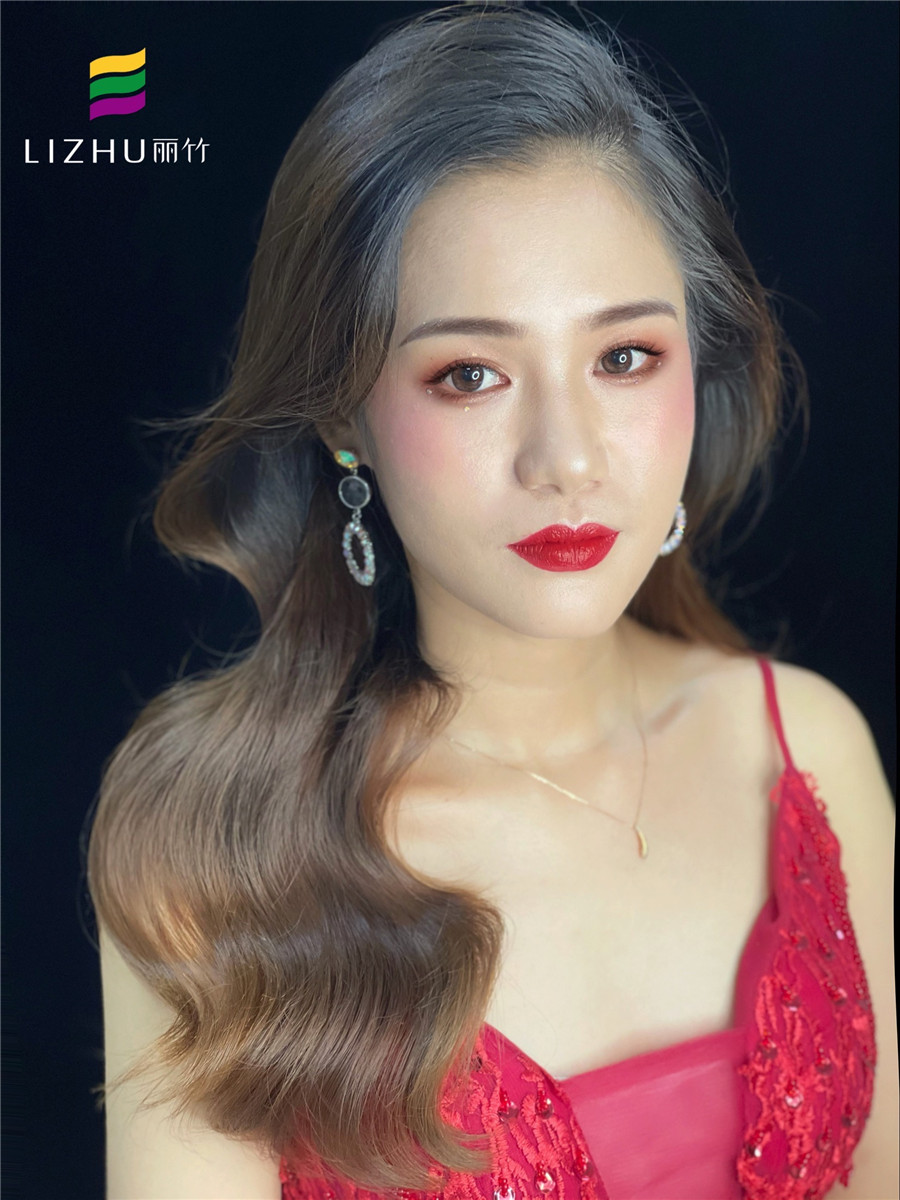 南寧化妝培訓(麗竹彩妝培訓學校)作品:簡約禮服造型:粉橘色溫柔的妝容,優(yōu)雅婉約的韓式披發(fā),搭配大氣紅色珠片禮服,散發(fā)簡約的美。