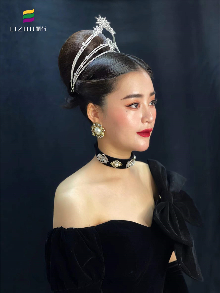 南寧網(wǎng)紅化妝培訓(xùn)作品:優(yōu)雅大方的造型,結(jié)合鉆石復(fù)古發(fā)型,溫柔眉眼帶來(lái)的柔美感覺(jué),即使身穿高冷的黑禮服,也讓人心生愛(ài)戀。