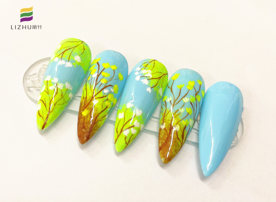 廣西時尚美甲培訓、廣西美甲學習:春日的代表色,怎么能少得了綠色,黃色,和藍色呢?如果讓你將這幾種顏色組合在一起繪制一幅春日美甲作品,你想好怎么創(chuàng)作了嗎?如果還沒有想好,不如就先看看廣西專業(yè)正規(guī)美甲學校(麗竹美甲學校)作品吧!