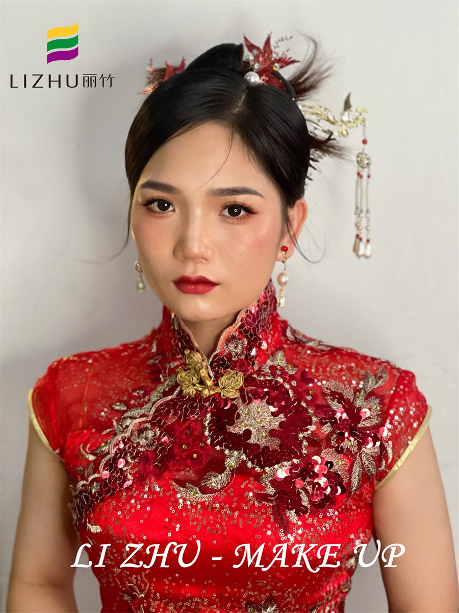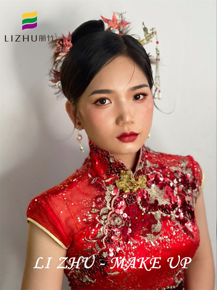 南寧新娘妝培訓學校、南寧新娘妝教得好的培訓、南寧新娘妝培訓班作品---新娘敬酒造型:簡潔大方的高發(fā)髻盤發(fā),耳邊靈動的抽絲碎發(fā),輪廓感極強的絹花發(fā)飾,配搭大氣優(yōu)雅的珍珠耳飾,與紅色亮片刺繡相互呼應,更能襯托新娘貴氣喜慶的氣質。如果你也想在南寧學新娘妝,或是想知道南寧學新娘妝的學校有哪些?歡迎到麗竹學校參觀試聽。