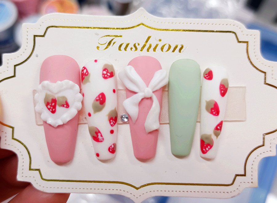 廣西學(xué)美甲:以少女們喜愛的粉色和白色作為主色調(diào),馬卡龍綠色則作為點(diǎn)睛之筆。之后使用彩繪筆專業(yè)描繪出可愛草莓圖案,配上粘貼白色蝴蝶結(jié)和愛心飾品做點(diǎn)綴,直接將草莓彩繪美甲的可愛感氛圍拉滿。