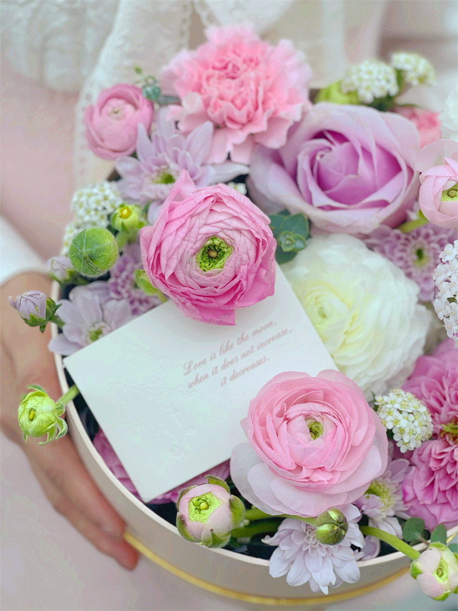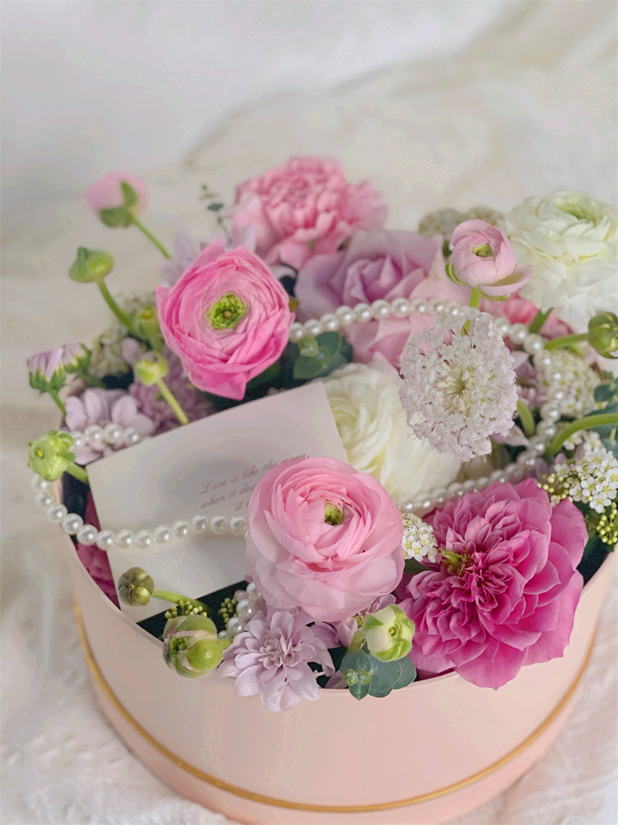在制作韓式花盒時,花盒以及花材的色彩采用單色或同色系,即使選擇撞色的花材進行搭配,也要適中保持干凈整潔。在進行插花設(shè)計時,遵守風(fēng)格自然,精致浪漫,配色清新,不局限于單一品種……這樣打造出來的花盒總能散發(fā)出一絲感性與溫暖的色彩。