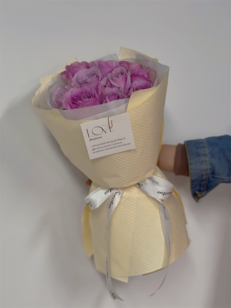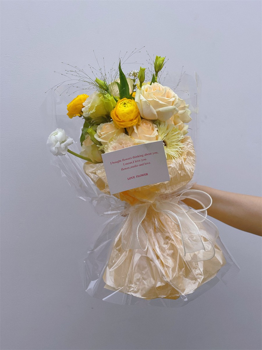 在進(jìn)行圓形花束的制作時(shí),在確定主花后,便可以按照螺旋的方式一次添加花材,使得整束花看起來(lái)飽滿之后,稍作調(diào)整成為一個(gè)圓形的輪廓,然后便可以用繩子在根部綁好進(jìn)行修剪?;ú奶幚砗昧酥螅瑢b紙裁剪出適當(dāng)?shù)拇笮?,然后根?jù)花的形狀包裹起來(lái),用彩帶幫緊并打成一個(gè)蝴蝶結(jié),這樣圓形小花束就完成了。