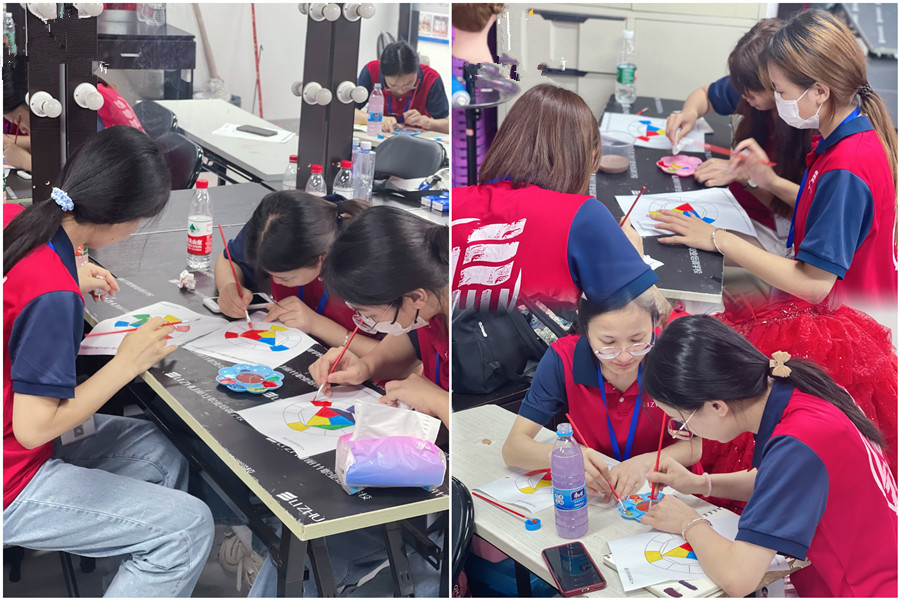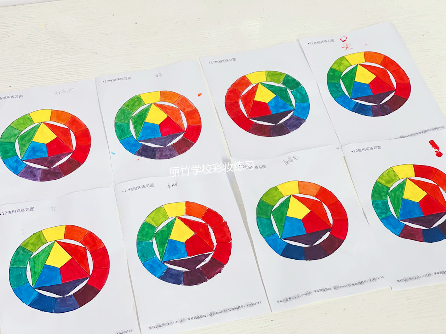化妝基礎(chǔ)理論知識、南寧化妝基礎(chǔ)教學(xué):在今天的南寧化妝課堂上,學(xué)員們在聽完玉老師講解的關(guān)于色彩十二色環(huán)的理論知識后,便拿出畫筆顏料,根據(jù)三原色,冷暖色系的搭配等,進行十二色環(huán)紙上練習(xí)。下面,和南寧化妝師培訓(xùn)學(xué)校-麗竹化妝培訓(xùn)一起學(xué)看看學(xué)員們的練習(xí)成果如何吧?