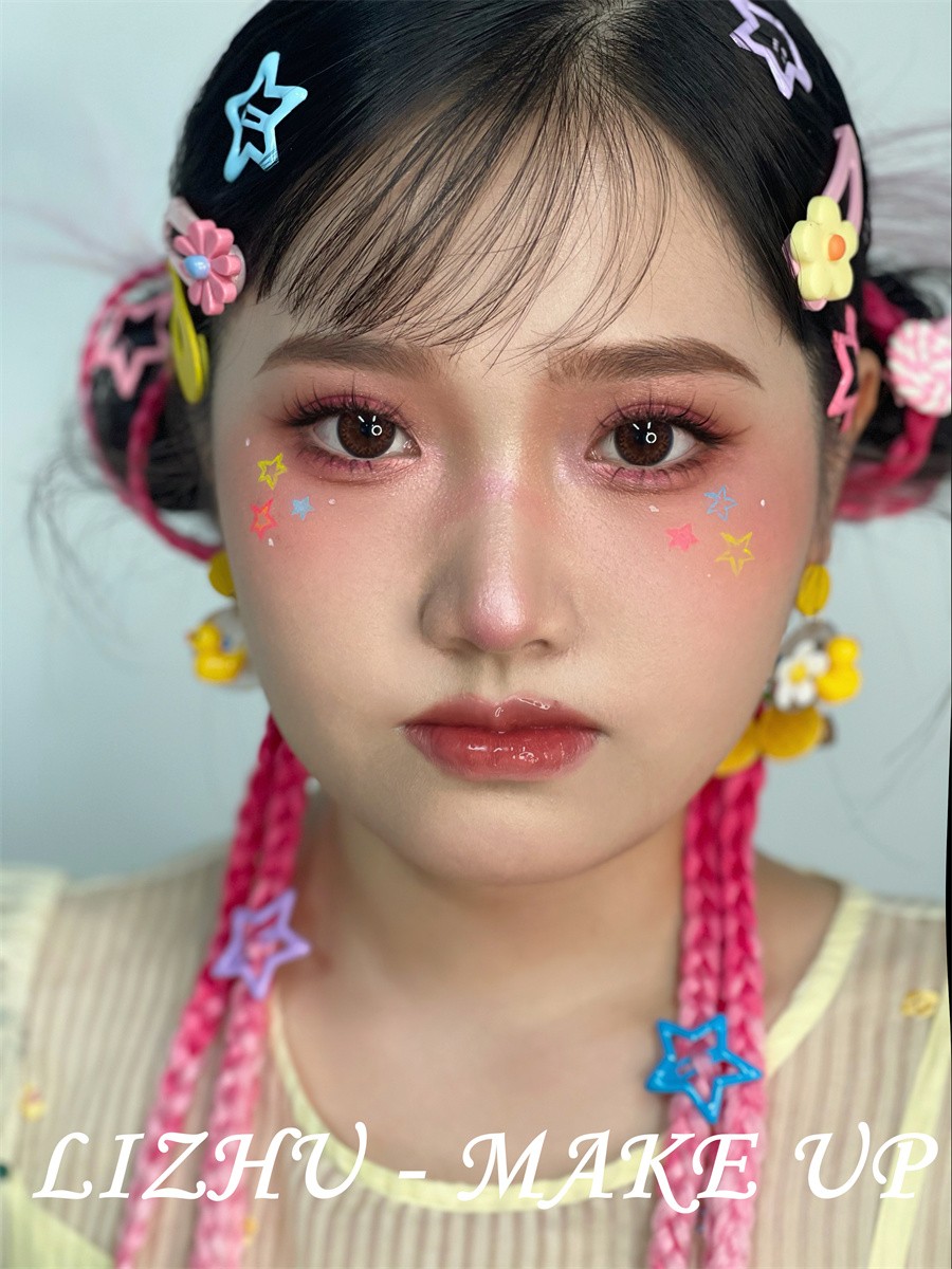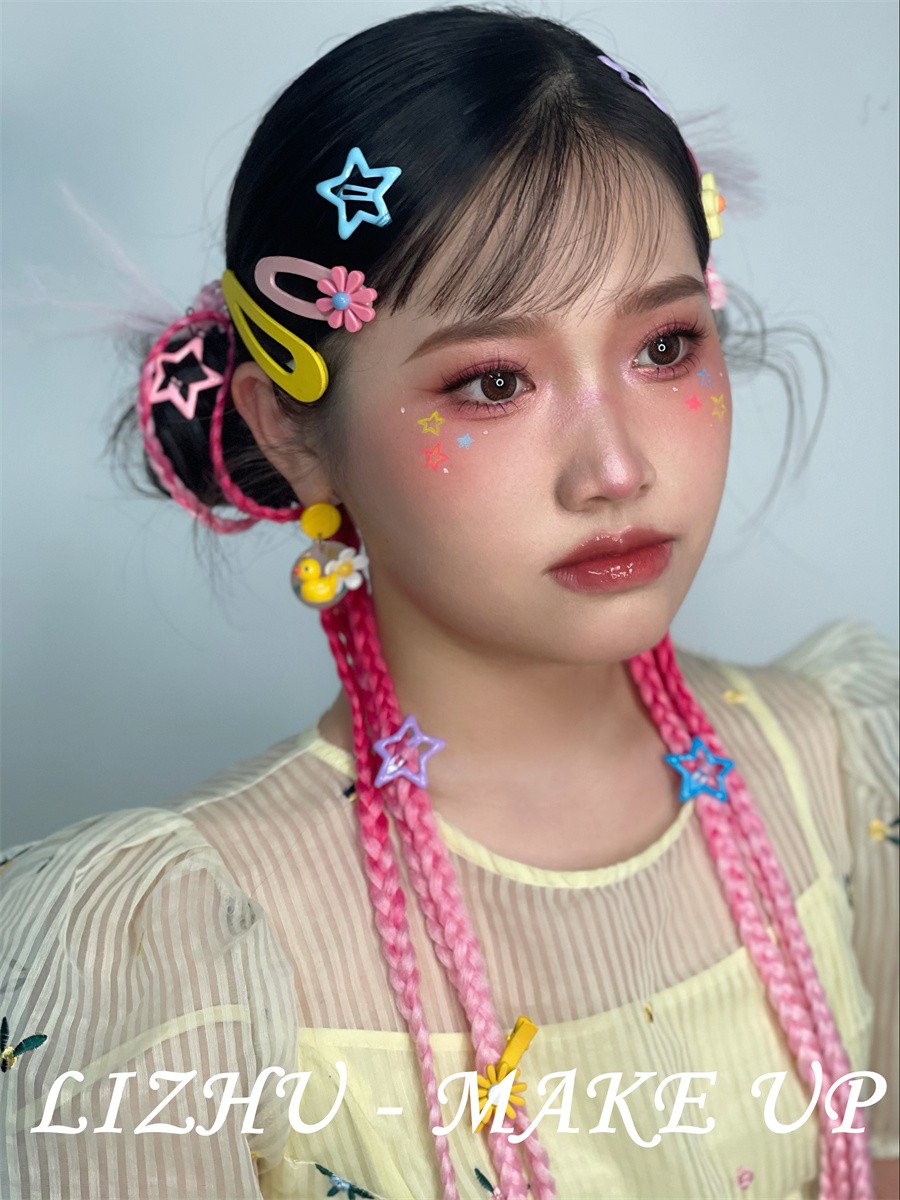 網(wǎng)紅妝容圖片、廣西化妝彩妝培訓(xùn):多巴胺風(fēng)格,主要是指通過顏色搭配營造出一種愉悅感的風(fēng)格。對高飽和度的色彩進(jìn)行協(xié)調(diào)搭配,于鮮亮彩色中尋求協(xié)調(diào)與平衡,這樣打造出的容造型總能給人一種可愛,童趣,快樂的感覺。
