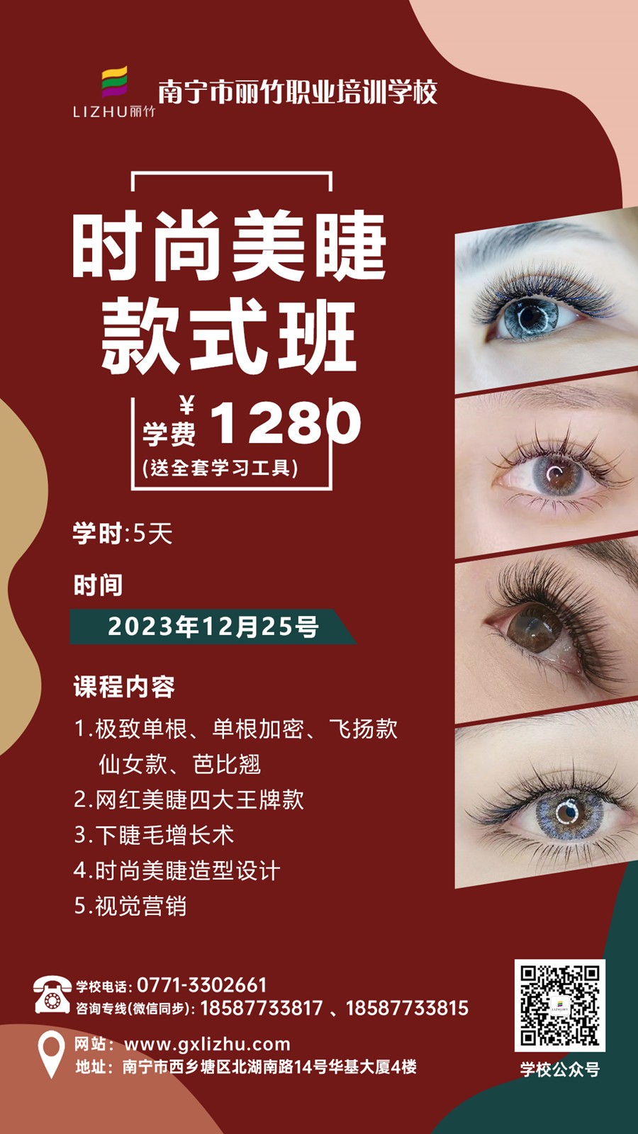 如果你是上述的人群之一,那么你就是適合學(xué)習(xí)美睫的人群啦!所以,千萬(wàn)不要錯(cuò)過(guò)學(xué)時(shí)短,學(xué)費(fèi)親民,易上手,引流拓客快速的美睫項(xiàng)目啦!南寧專(zhuān)業(yè)培訓(xùn)美睫師(麗竹時(shí)尚美睫款式班)將于12月25日正式開(kāi)班,現(xiàn)在報(bào)名不僅可以享受親民學(xué)費(fèi),還能送全套學(xué)習(xí)工具哦,把握現(xiàn)在趕緊報(bào)名吧!