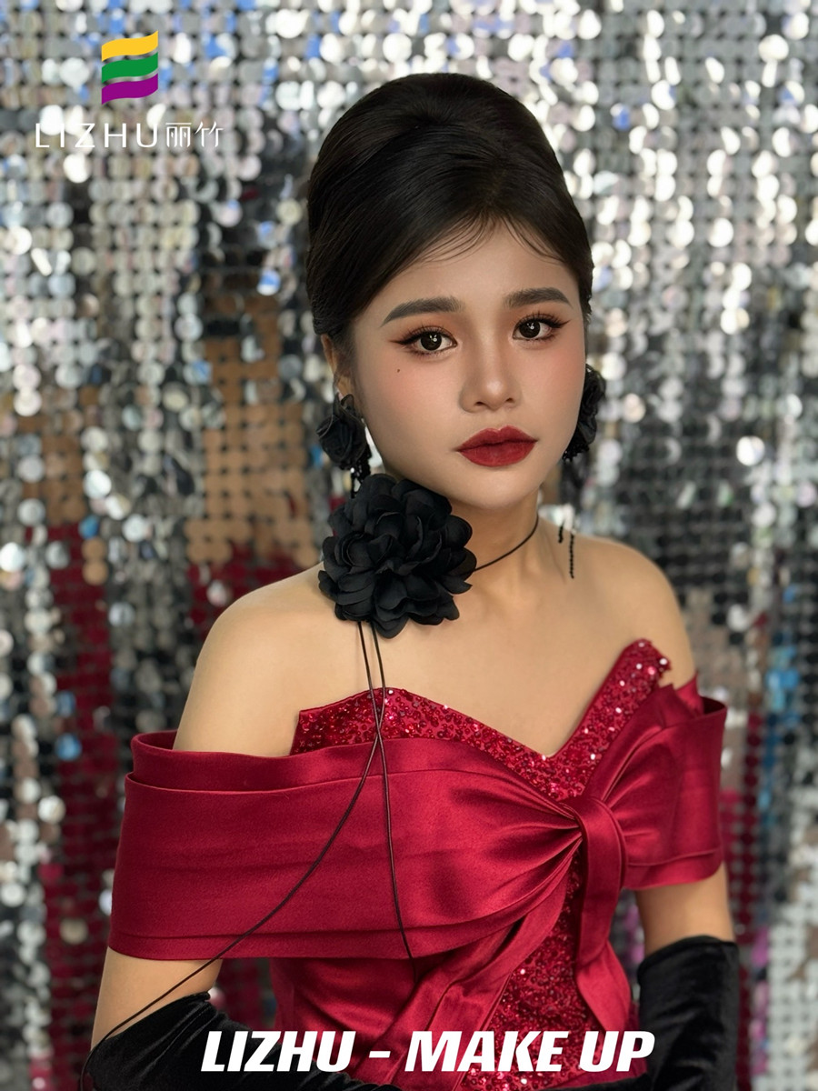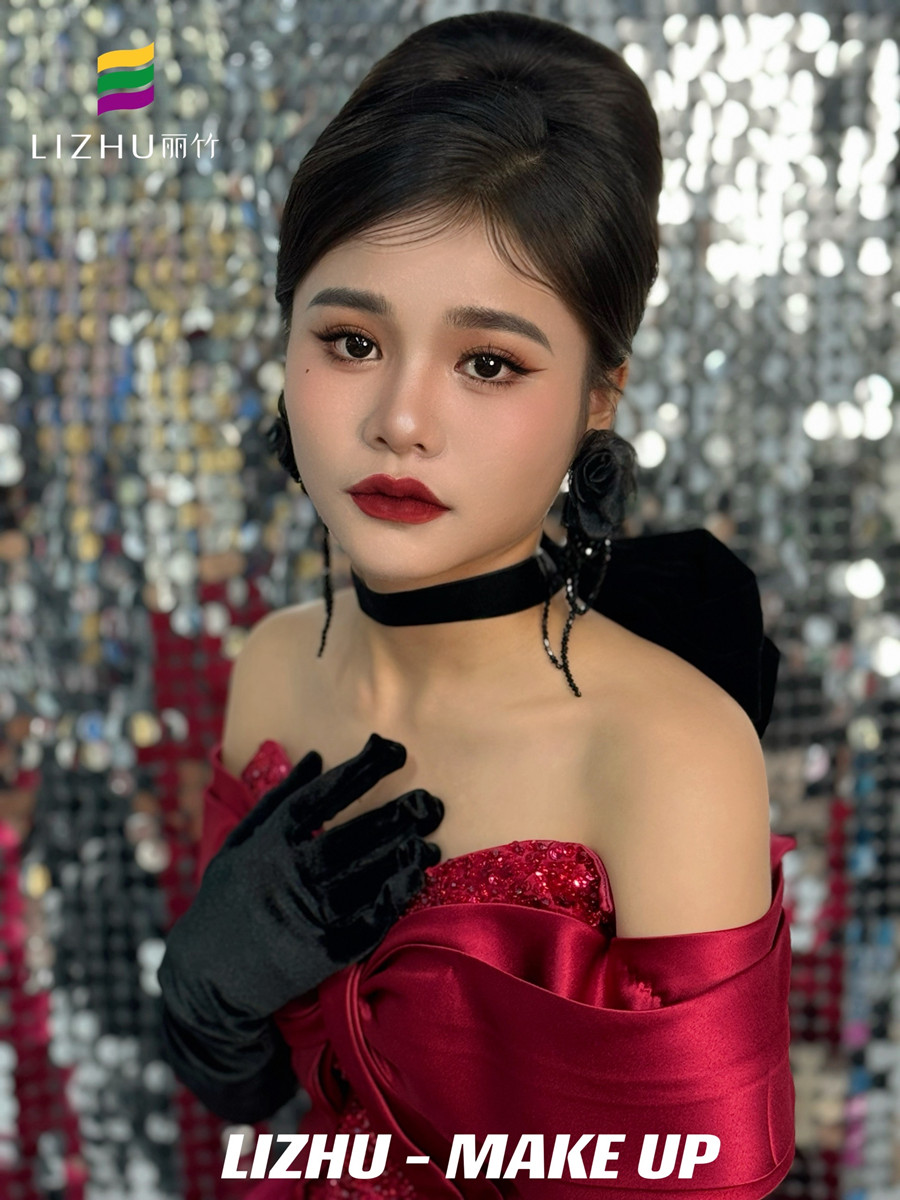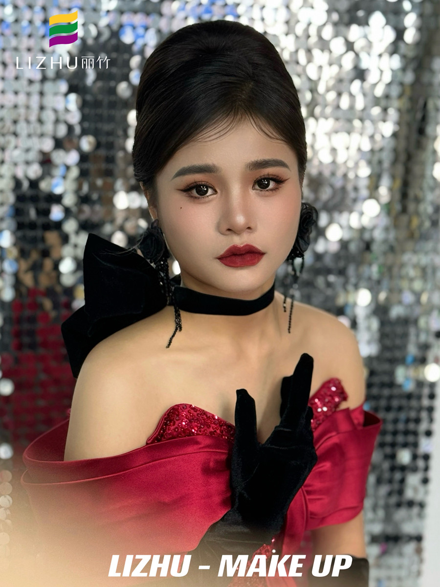 南寧化妝美業(yè)學習、南寧化妝彩妝(麗竹化妝彩妝培訓)作品---復古年會造型:明媚動人氣質妝容,簡約大氣復古赫本發(fā)型,佩戴夸張黑色花朵配飾,身穿酒紅色亮片抹胸禮服,仿佛置身于年會中的紅玫瑰。想知道南寧化妝學校哪家時尚?或是想知道南寧學化妝學費便宜的是哪家?歡迎大家趁著麗竹學校正在進行招生優(yōu)惠活動之際,關注麗竹學校彩妝專業(yè),...