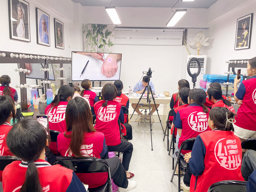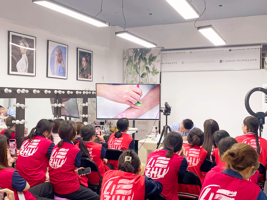 面部彩繪零基礎(chǔ)學習、廣西學面部彩繪:廣西彩妝化妝美妝造型學校(麗竹彩妝化妝造型學校)廣西彩妝造型進修班的教室里,玉老師正在一邊給同學們講解廣西化妝面部彩繪教學里關(guān)于什么是面部彩繪的內(nèi)容,一邊通過在手上作畫演示彩繪的畫法。