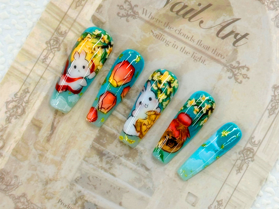 美甲圖片2024新款式、南寧美甲店推薦:說起中秋元素,怎么能少得了玉兔,桂花樹,美酒佳肴還有孔明燈呢?在團(tuán)圓之際,不如也讓你的手一起感受中秋的美好吧?