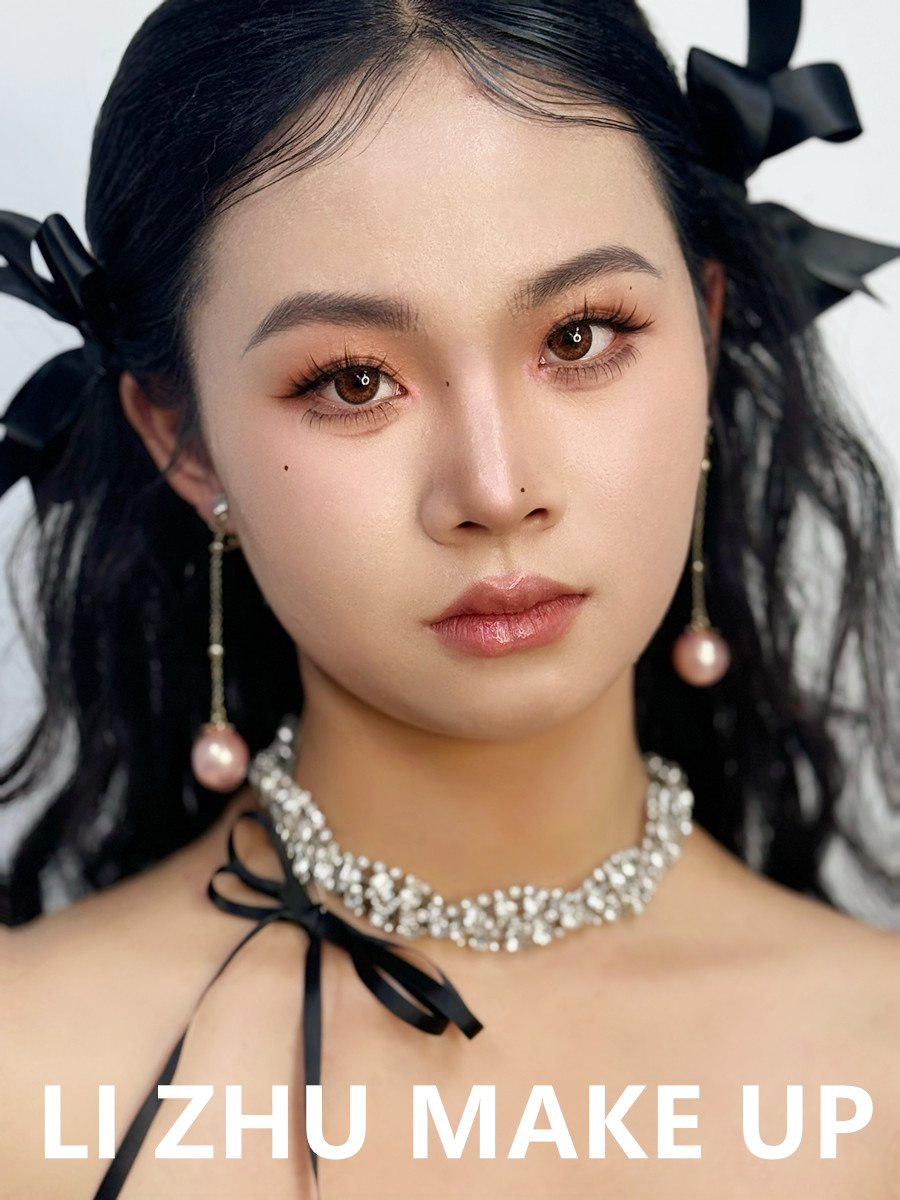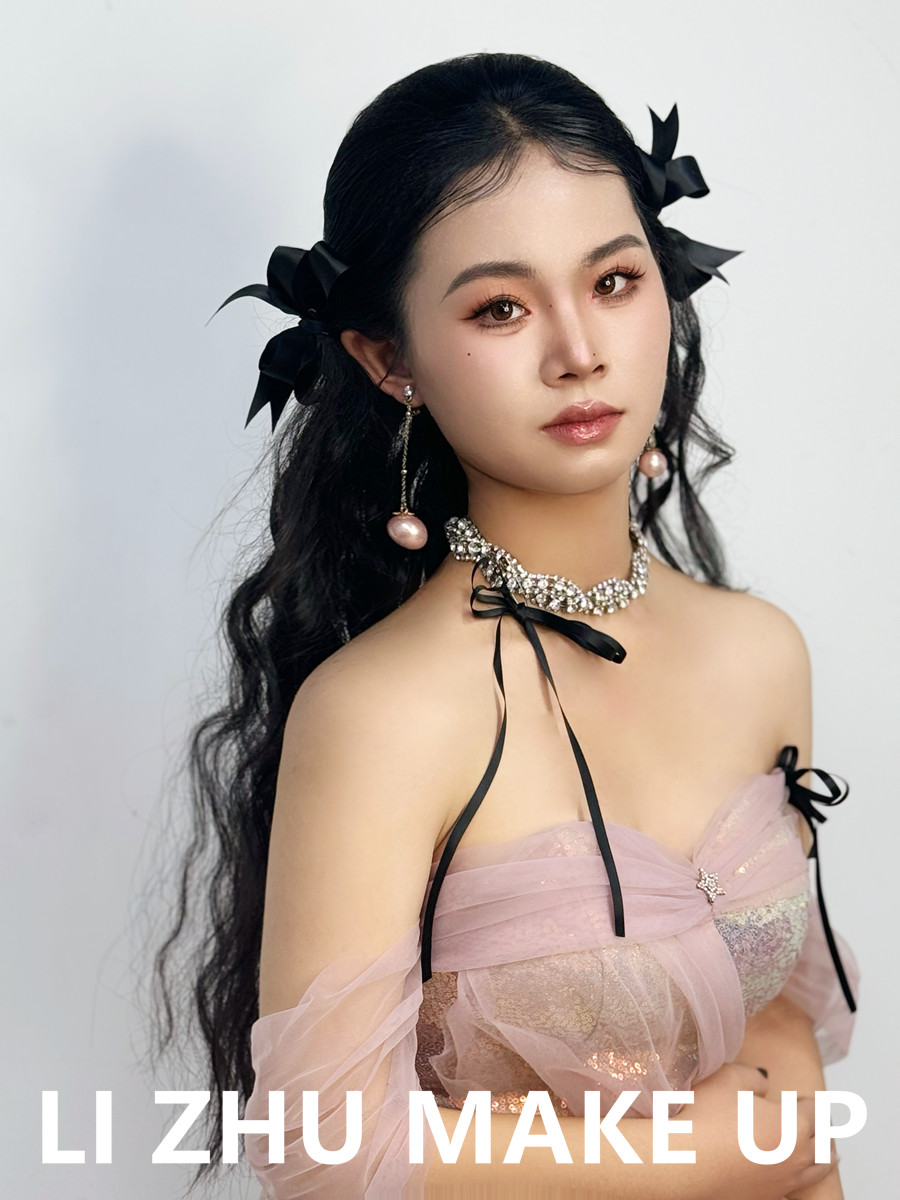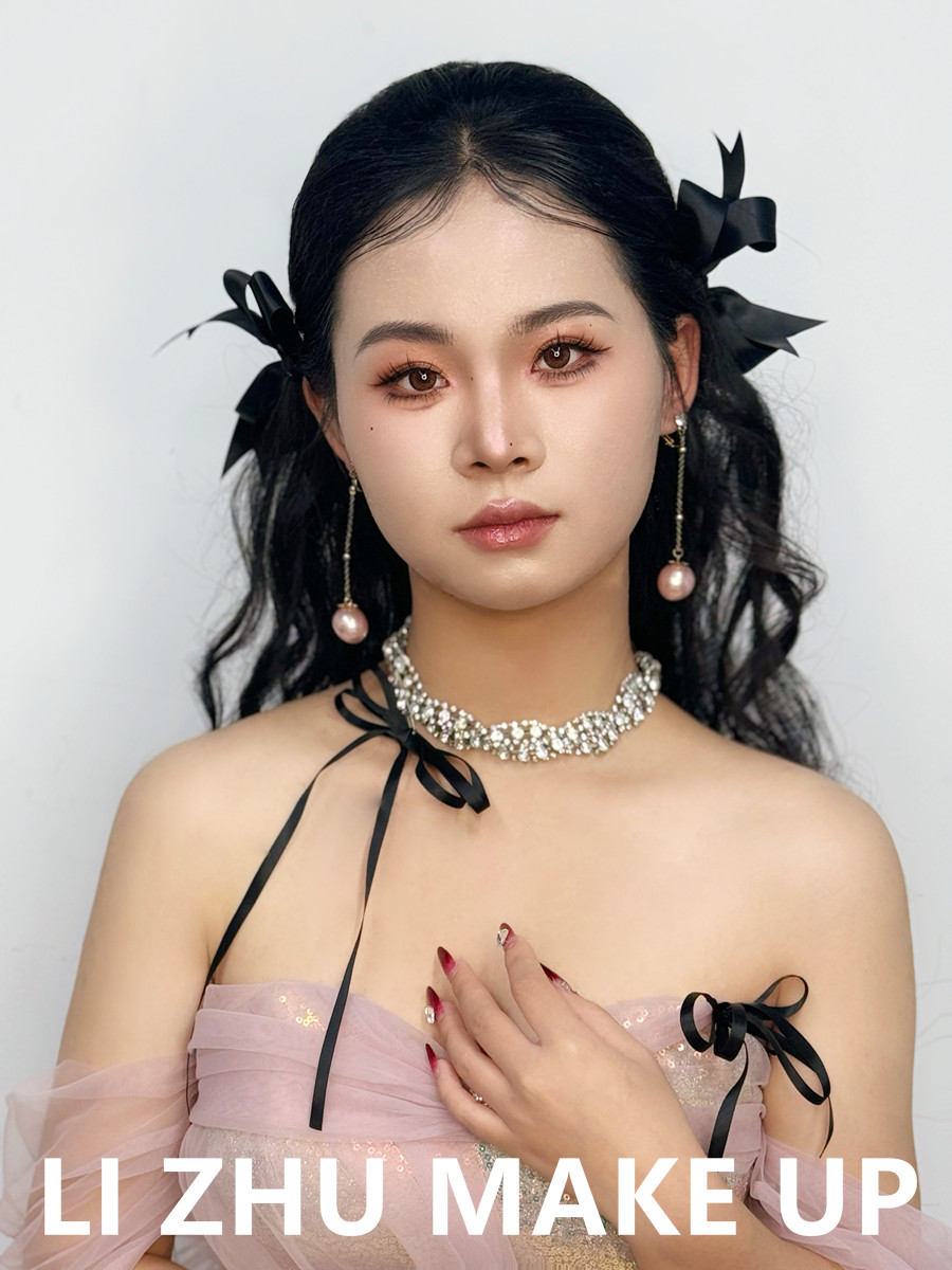 南寧化妝形象設(shè)計、南寧學(xué)化妝零經(jīng)驗、南寧化妝培訓(xùn)進(jìn)修提升(麗竹化妝造型學(xué)校)作品---韓式甜美新娘:自然服貼的韓式底妝,粉橘色亮眼的眼妝和唇妝,成套蝴蝶結(jié)飾品點綴,讓身著粉色紗質(zhì)禮服造型更加甜美。