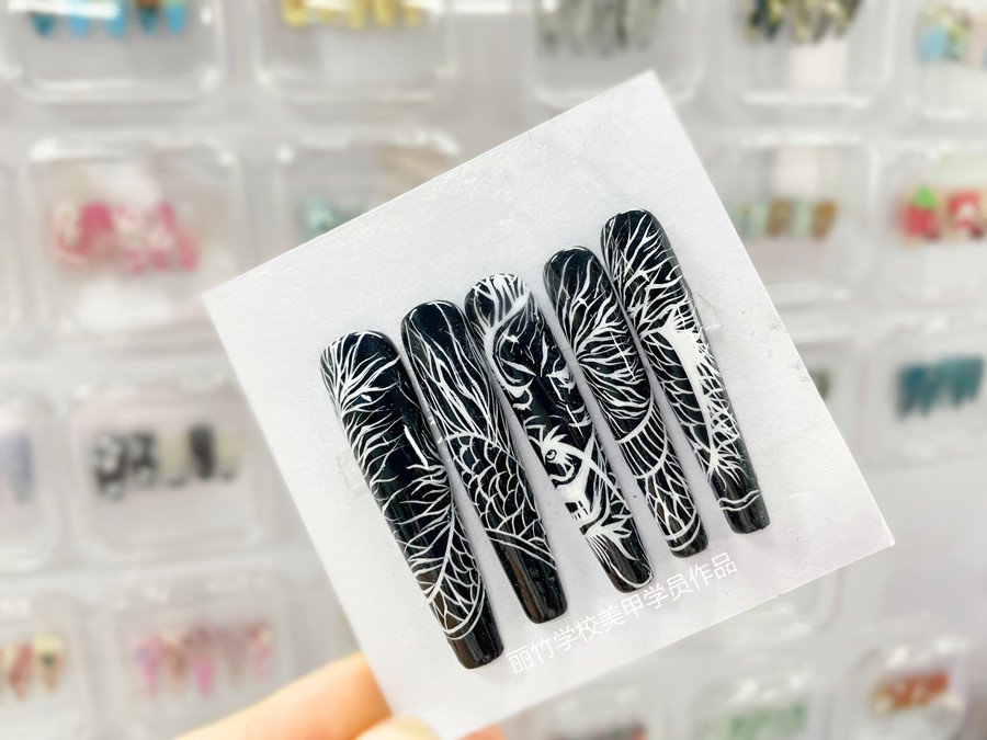 南寧美甲專業(yè)、南寧美甲學習:美甲技法解析-作品主要以線條繪制的美甲技巧而成。采用中國傳統(tǒng)的黑白兩色作為主要色彩,以黑色作為大底線,才使用畫線筆勾畫出白色龍紋線條。黑白顏色形成的強烈視覺效果,加上坐著細膩專業(yè)的繪畫功底,使得整副作品透露出了濃濃的國風色彩。