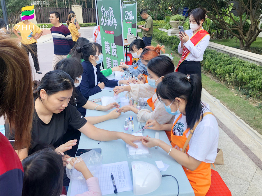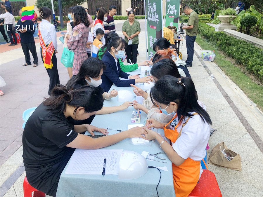 美甲外出實(shí)操、南寧美甲公益活動(dòng)分享:10中旬的南寧,早上已經(jīng)感到很明顯的涼意,但在新希望社區(qū)的花園廣場(chǎng)上,卻熱火朝天,人聲鼎沸,仿佛入秋的涼意從未在這里停留。而在這里,南寧美甲學(xué)校-麗竹學(xué)校美甲專業(yè)在黨支部的帶領(lǐng)下,正在為居民們進(jìn)行美甲公益活動(dòng)。