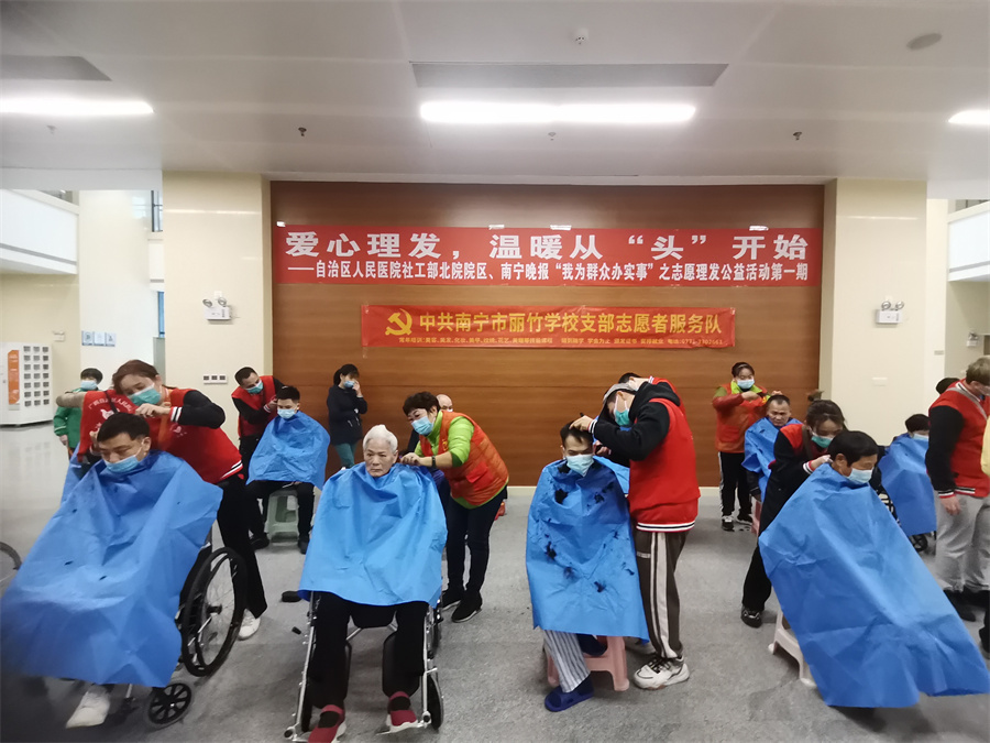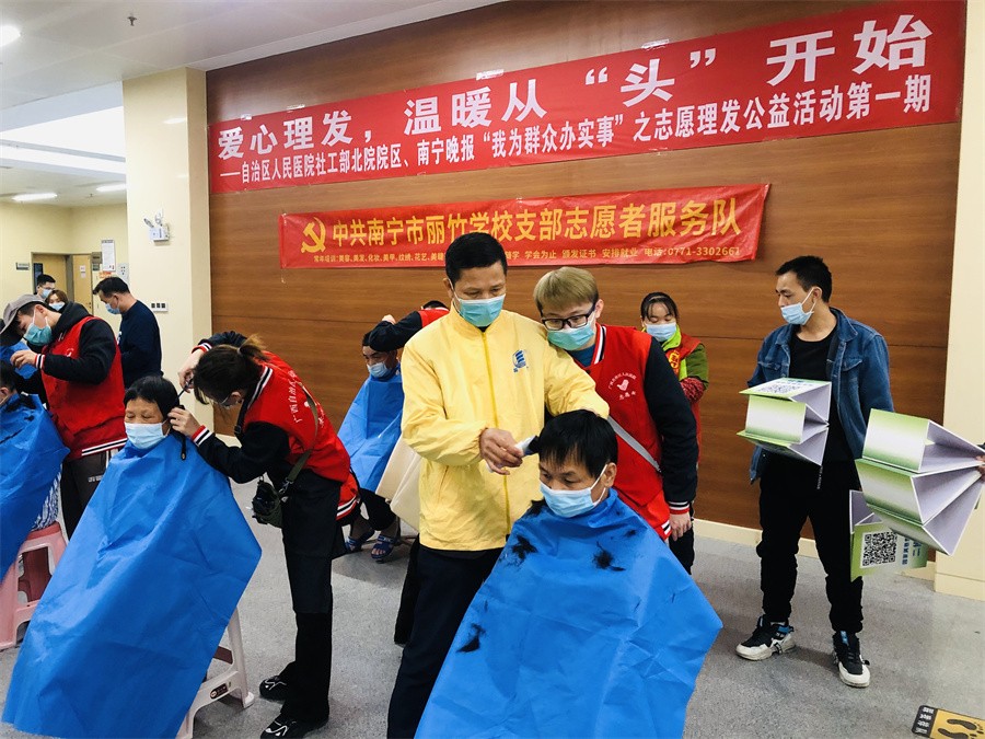 愛心理發(fā)進(jìn)醫(yī)院、南寧美發(fā)學(xué)校志愿理發(fā)活動:12月3日,對于一些長期待在醫(yī)院的患者和家屬而言,不能隨意外出,久而久之理發(fā)成為了“頭”等大事。知道這樣的情況后,中共麗竹學(xué)校學(xué)校支部志愿者服務(wù)隊主動申請參加由南寧晚報“愛幫之家”聯(lián)合自治區(qū)人民醫(yī)院北院共同舉辦的---愛心理發(fā),溫暖從“頭”開始志愿公益理發(fā)活動,發(fā)揮專業(yè)特長,為有需要的人提供綿薄之力。