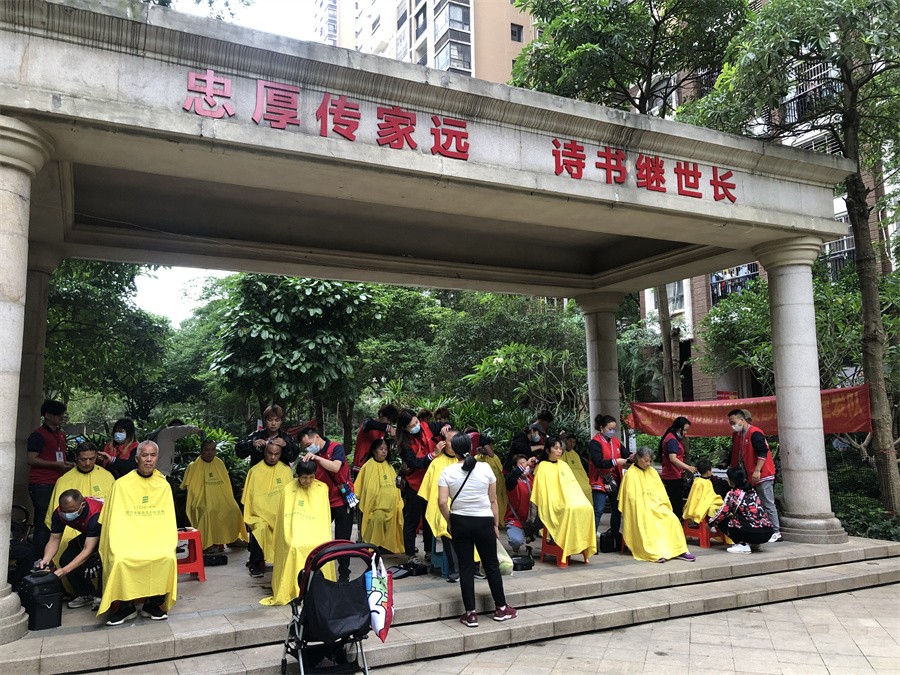 廣西美發(fā)培訓(xùn)職業(yè)學(xué)校-2023年5月11日,麗竹美發(fā)志愿者到藍(lán)山上城小區(qū)為居民免費(fèi)理發(fā)