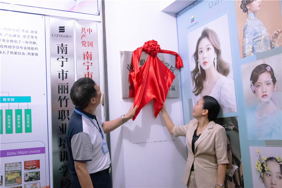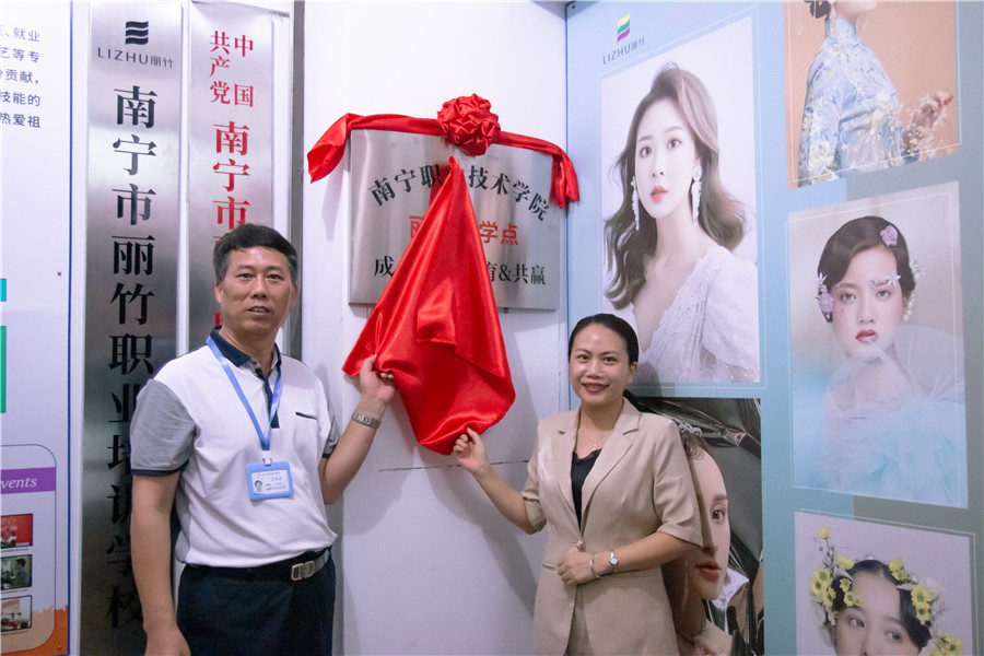 參加本次簽約揭牌儀式的嘉賓有:南寧麗竹職業(yè)培訓(xùn)學(xué)校黨支部書記,校長(zhǎng)王良友、南寧職業(yè)技術(shù)學(xué)院---共贏教學(xué)點(diǎn)校長(zhǎng)徐穆英、南寧麗竹職業(yè)培訓(xùn)學(xué)校副校長(zhǎng)歐榮蘭、南寧麗竹職業(yè)培訓(xùn)學(xué)校招生就業(yè)部主任潘偉平、南寧麗竹職業(yè)培訓(xùn)學(xué)校教學(xué)部主任劉治才、南寧職業(yè)技術(shù)學(xué)院---市場(chǎng)招生辦教務(wù)監(jiān)督主任李容、南寧麗竹職業(yè)培訓(xùn)學(xué)?;瘖y總監(jiān)玉可寧、南寧麗竹職業(yè)培訓(xùn)學(xué)校美發(fā)組組長(zhǎng)王姚芳、南寧麗竹職業(yè)培訓(xùn)學(xué)校美容組組長(zhǎng)韋紅蘭以及麗竹學(xué)校美容,美發(fā),美甲,化妝組老師。