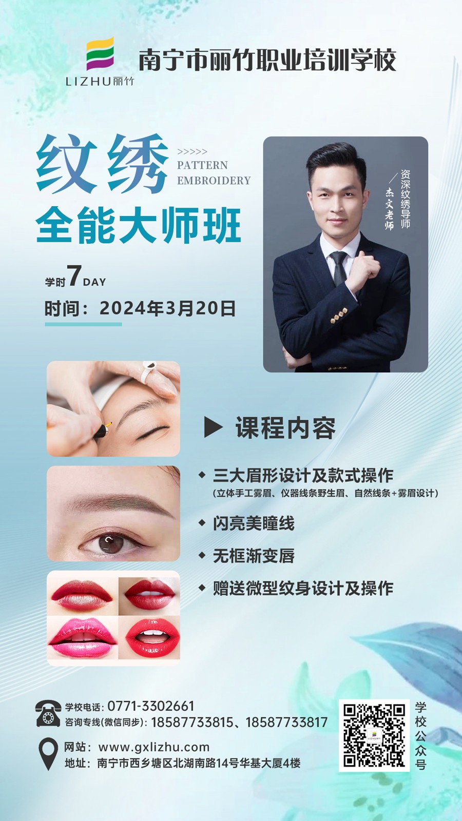 南寧紋繡培訓(xùn)、南寧紋繡學(xué)校排名:想在南寧學(xué)紋繡,想知道南寧紋繡學(xué)校哪家好?南寧紋繡學(xué)校排行榜推薦你,可以到南寧紋繡培訓(xùn)學(xué)校(麗竹紋繡培訓(xùn)學(xué)校),去了解即將在3月20日開(kāi)班的紋繡全能大師班的詳細(xì)課程內(nèi)容以及報(bào)名優(yōu)惠活動(dòng)。