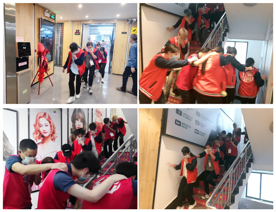 為了讓大家實(shí)地感受發(fā)生火災(zāi)時(shí)逃生的緊迫感,師生在老師和李教員的引導(dǎo)下,進(jìn)行了消防疏散逃生演練。低頭彎腰,相互將右手搭在前一個(gè)人的肩膀上,左手用濕毛巾捂住口鼻,緊貼著樓梯,有序地從樓上快速下樓疏散到安全區(qū)域。