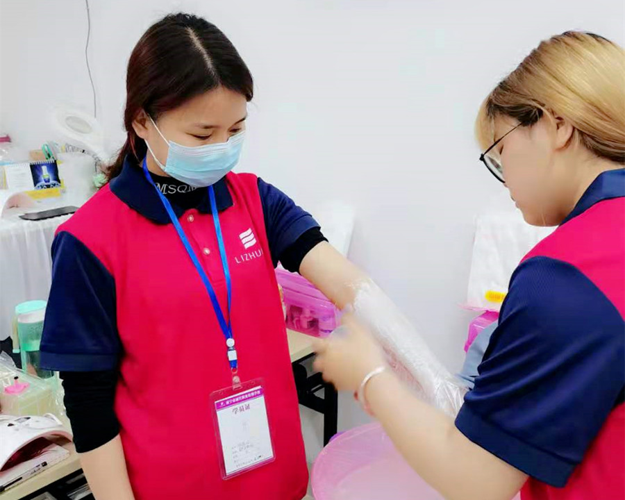 麗竹學(xué)校美甲專業(yè)-學(xué)員陸慧玲進行美甲手部護理練習(xí)