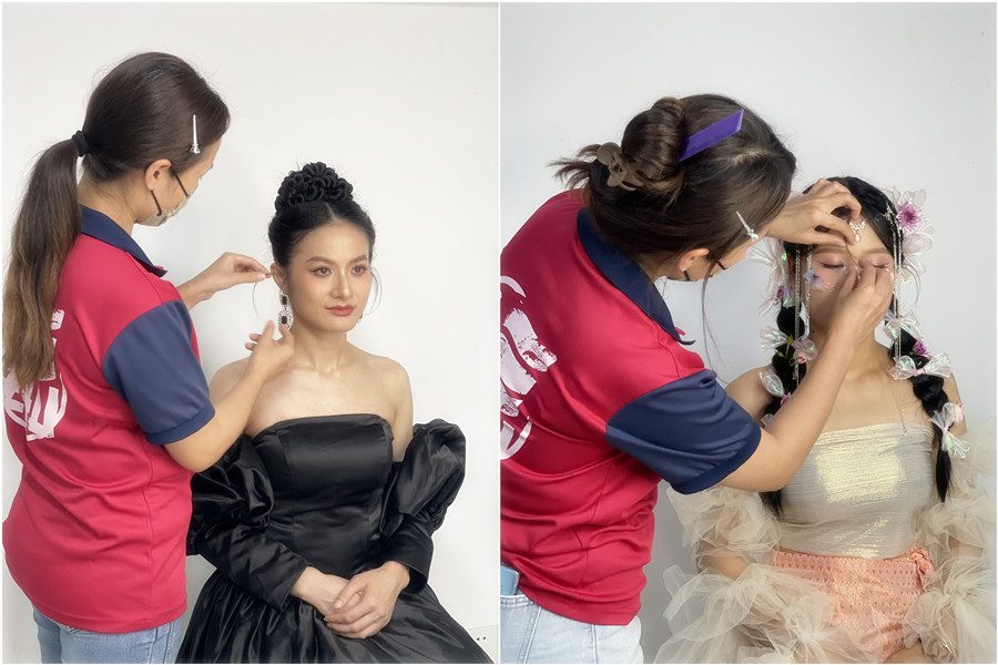 首先是在進(jìn)行發(fā)型操作時(shí)候使用的力度完全不一樣,稍微用力就會(huì)給顧客造成疼痛感,這是在練習(xí)假頭模時(shí)沒(méi)有注意到。然后就是對(duì)于時(shí)間的管理,不同于假頭模練習(xí)時(shí)可以磨磨蹭蹭,在進(jìn)行真人操作的時(shí)候必須要在規(guī)定的時(shí)間完成,因?yàn)橐粋€(gè)完整的妝造是由妝面和發(fā)型共同組成的,所以每個(gè)項(xiàng)目都要合理的分配時(shí)間。